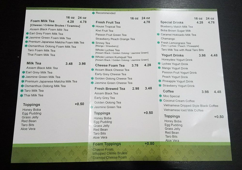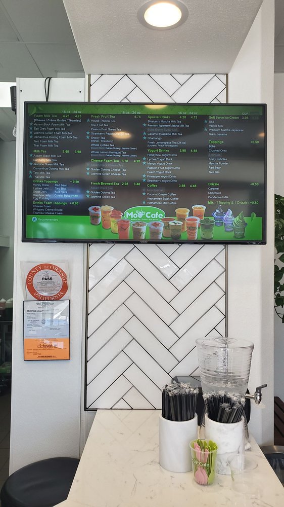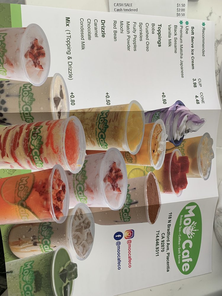 Moo Cafe located in Placentia, CA offers a diverse menu of bubble teas, coffees, and teas, with the option for delivery, takeout, and outdoor seating. The menu includes a variety of drinks such as Milk Teas, Jasmine Green, Osmanthus Oolong, Strawberry Peach Orange Tea, and Mango Yogurt Drink. Customers have praised the strong tea flavors, quality drinks, and reasonable prices. The ambiance is described as quiet, with friendly staff and quick service. The owners are commended for their attention to detail and excellent quality drinks at great prices. Customers appreciate the rewards program and options for customizing sweetness levels and toppings. Overall, Moo Cafe is a hidden gem for tea lovers and a must-try for those looking for refreshing and flavorful drinks in a cozy atmosphere.